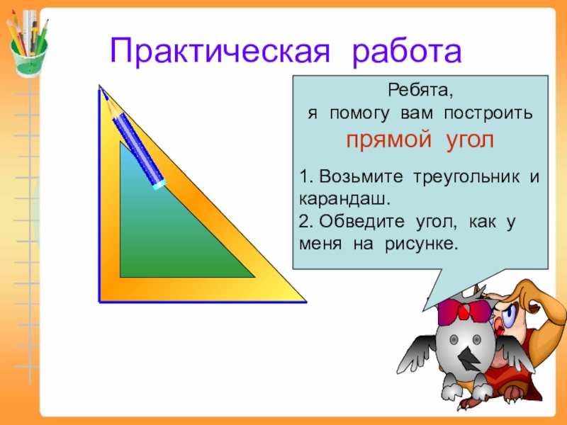 Практическая работаНачертите разные  углыРебята, я помогу вам построить прямой угол1. Возьмите треугольник и карандаш.2. Обведите угол,
