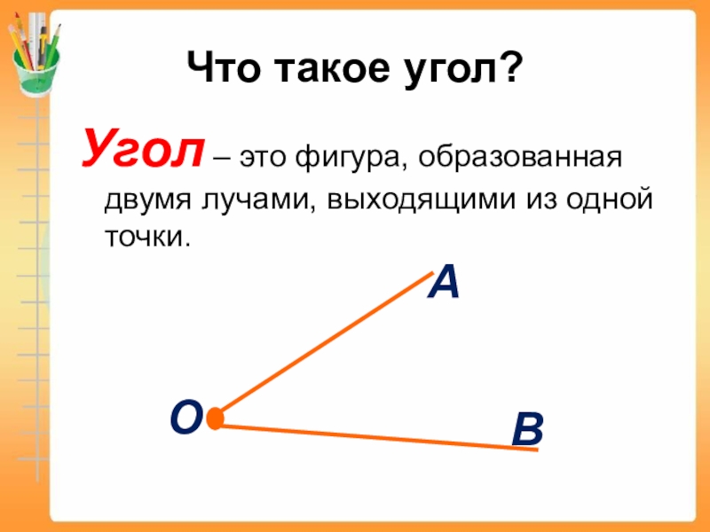 Что такое угол?Угол – это фигура, образованная двумя лучами, выходящими из одной точки.