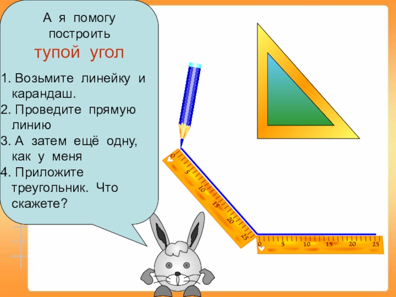 А я помогу построить тупой угол Возьмите линейку и карандаш. Проведите прямую линию А затем ещё одну,