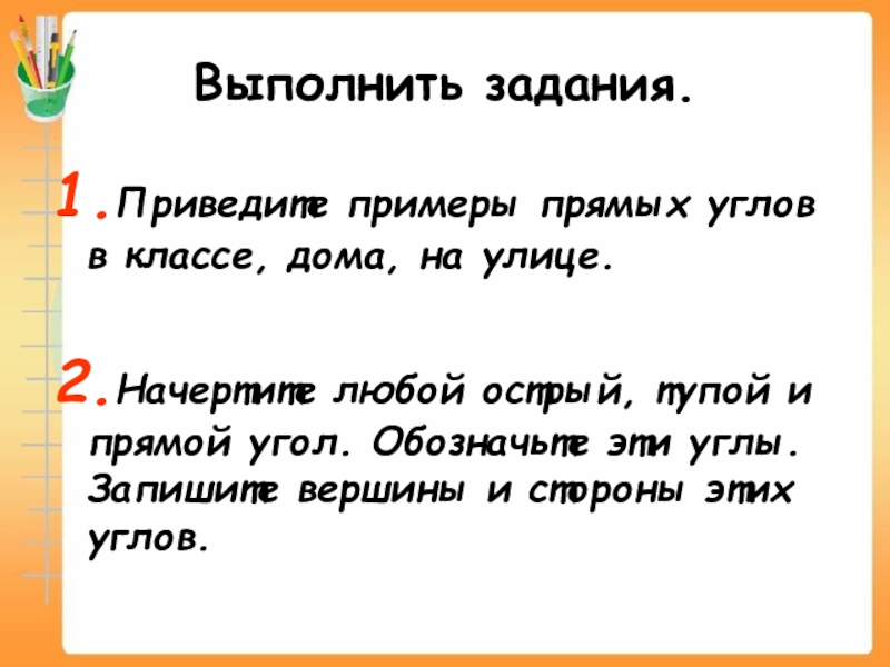 Выполнить задания.1.Приведите примеры прямых углов в классе, дома, на улице.2.Начертите любой острый, тупой и прямой угол. Обозначьте