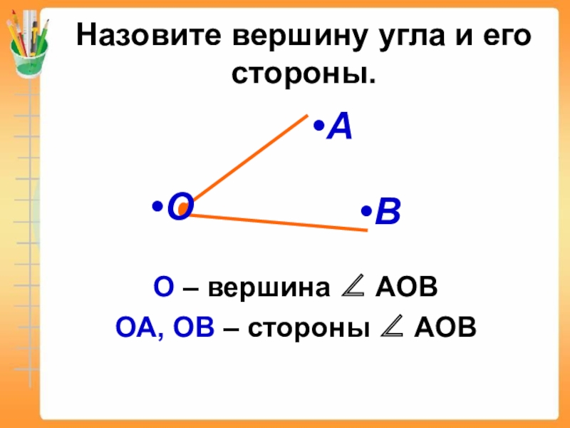 Назовите вершину угла и его стороны.О – вершина  АОВ ОА, ОВ – стороны  АОВ