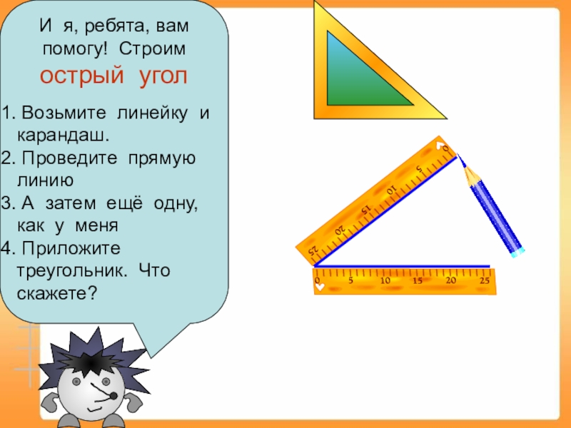 И я, ребята, вам помогу! Строим острый угол Возьмите линейку и карандаш. Проведите прямую линию А затем