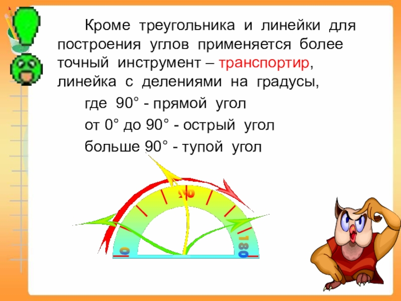 Слайд 13Кроме треугольника и линейки для построения углов применяется более точный инструмент