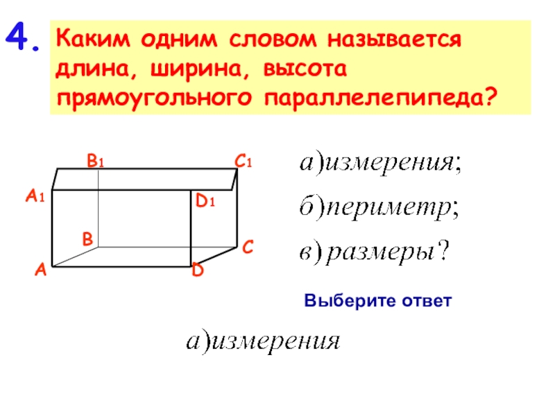 Каким одним словом называется длина, ширина, высота прямоугольного параллелепипеда? 4.Выберите ответ