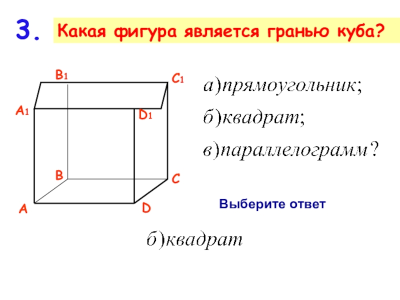 Является ли куб прямоугольным параллелепипедом? 6.Выберите ответКубПрямоугольный параллелепипед