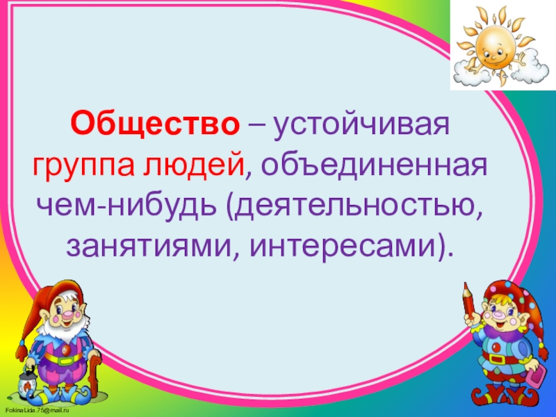 Общество – устойчивая группа людей, объединенная чем-нибудь (деятельностью, занятиями, интересами).