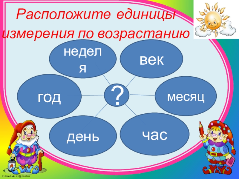Расположите единицы измерения по возрастанию?неделямесяцденьчасвекгод