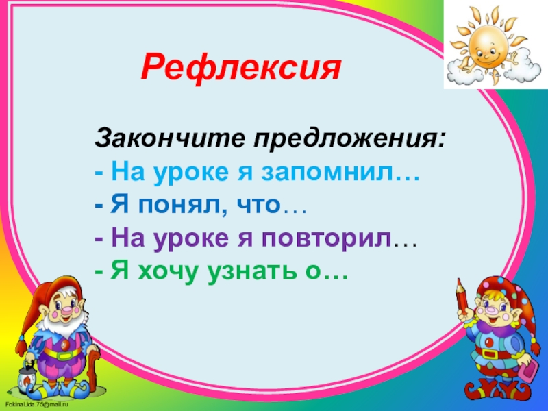 РефлексияЗакончите предложения:- На уроке я запомнил…- Я понял, что…- На уроке я повторил…- Я