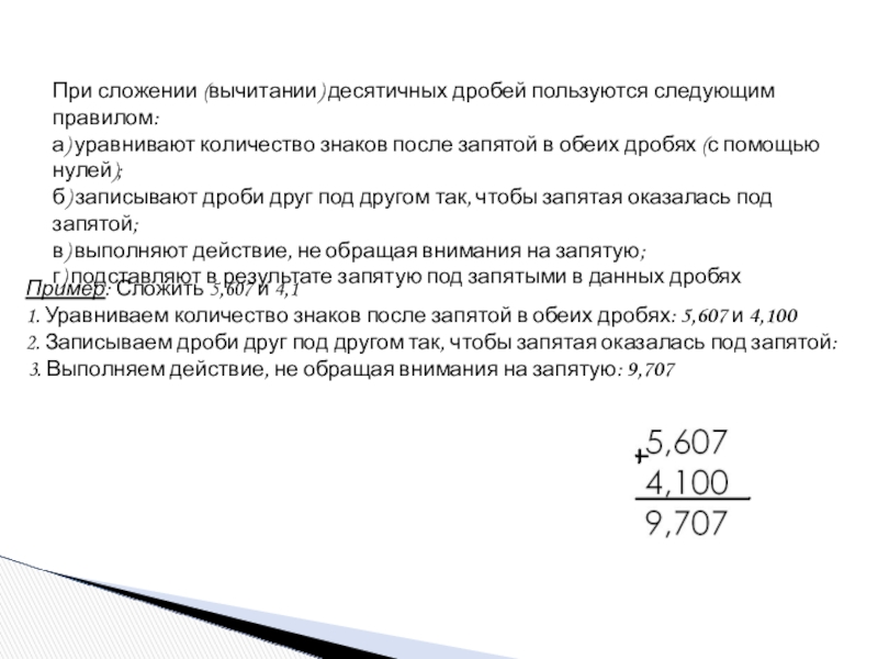 Пример: Сложить 5,607 и 4,1