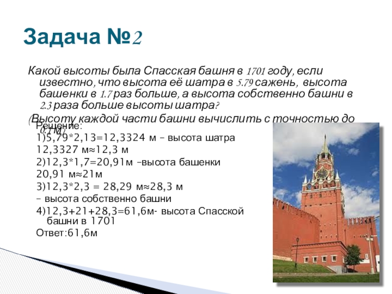 4)12,3+21+28,3=61,6м- высота Спасской башни в 1701
