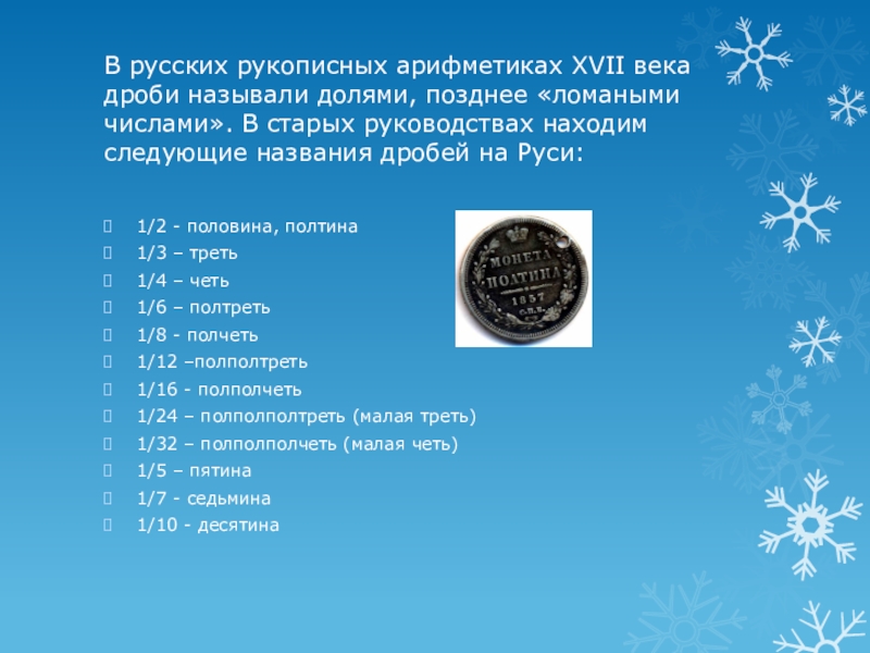 1/2 - половина, полтина