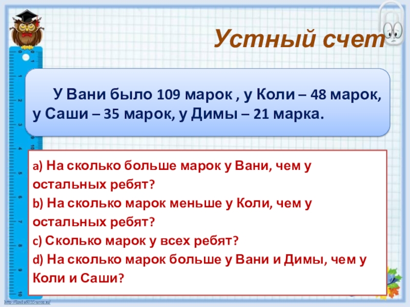 d) На сколько марок больше у Вани и Димы, чем у Коли и Саши?