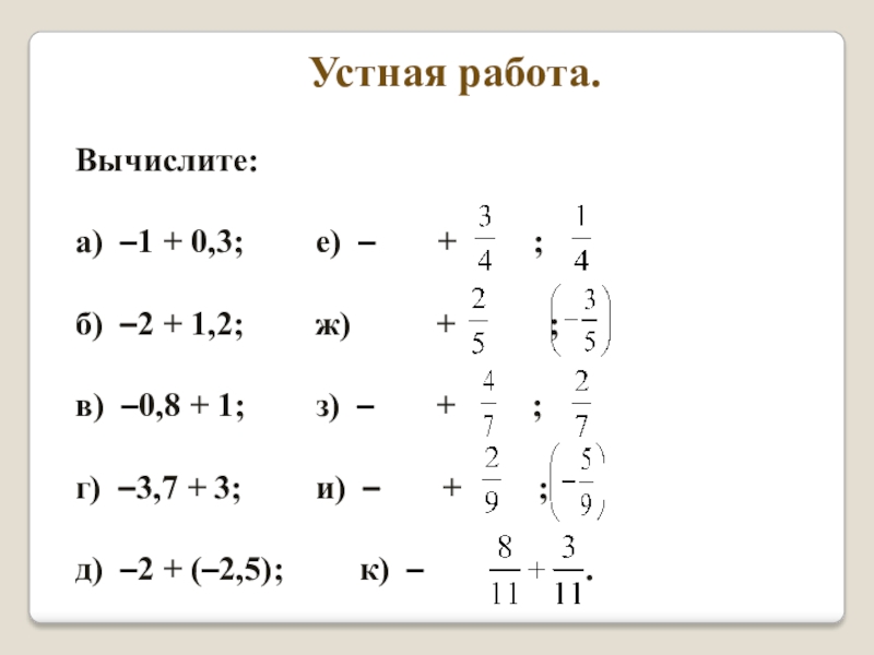 Устная работа.Вычислите:а) –1 + 0,3; е) – + ;б) –2 + 1,2; ж) + ;в) –0,8 + 1; з) –