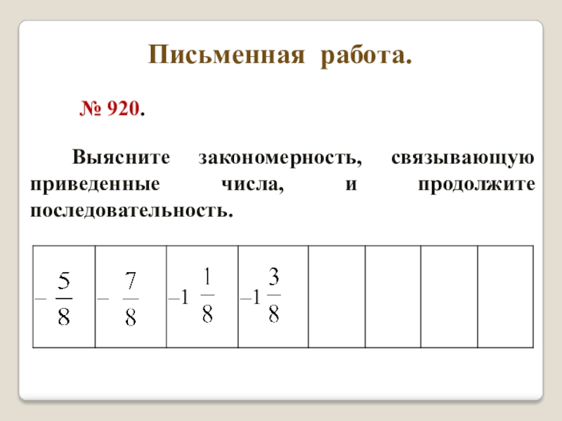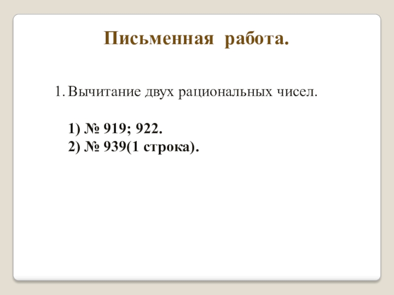 Вычитание двух рациональных чисел.1) № 919; 922.2) № 939(1 строка).Письменная работа.