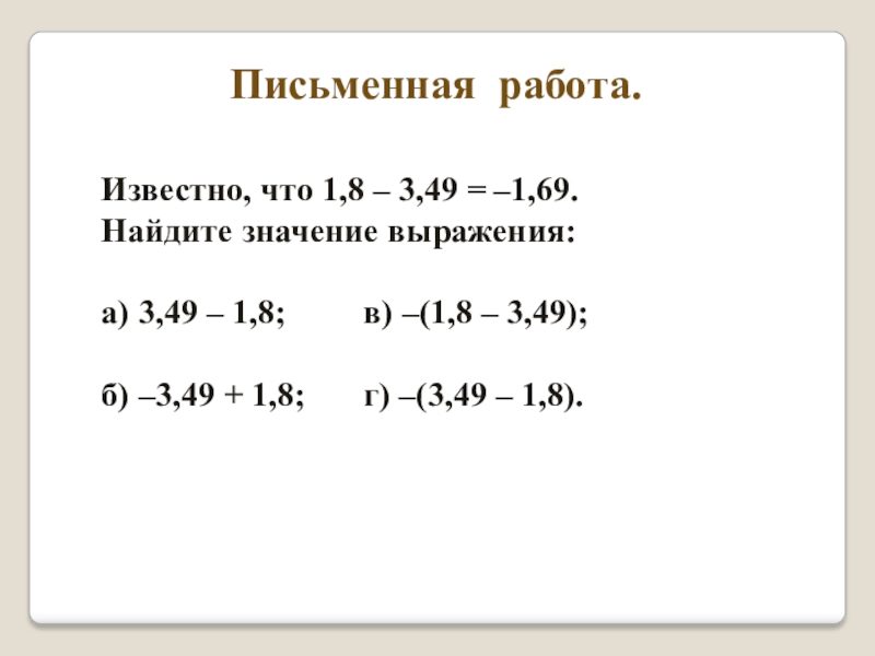 Известно, что 1,8 – 3,49 = –1,69. Найдите значение выражения:а) 3,49 – 1,8;		в) –(1,8 – 3,49);б) –3,49