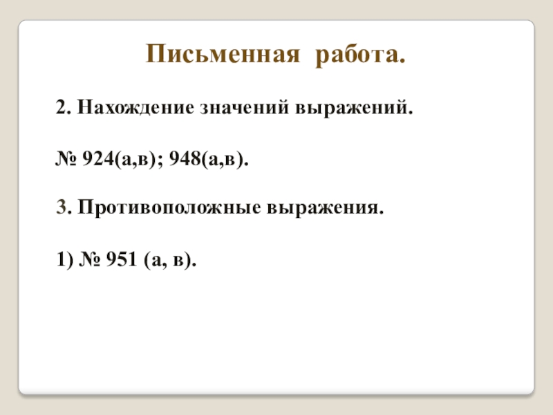 2. Нахождение значений выражений.№ 924(а,в); 948(а,в).Письменная работа.3. Противоположные выражения.1) № 951 (а, в).