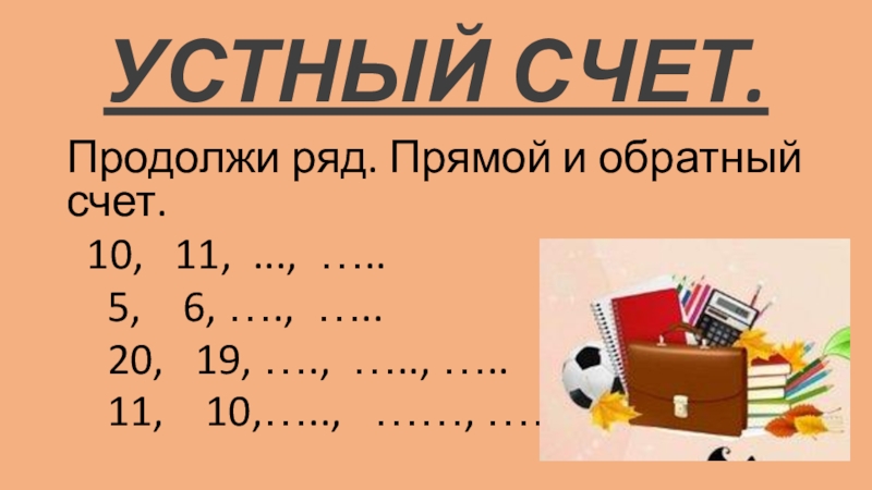 УСТНЫЙ СЧЕТ.Продолжи ряд. Прямой и обратный счет. 10,  11, ..., …..  5,  6, ….,