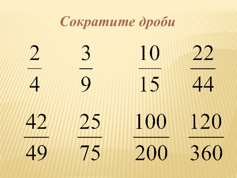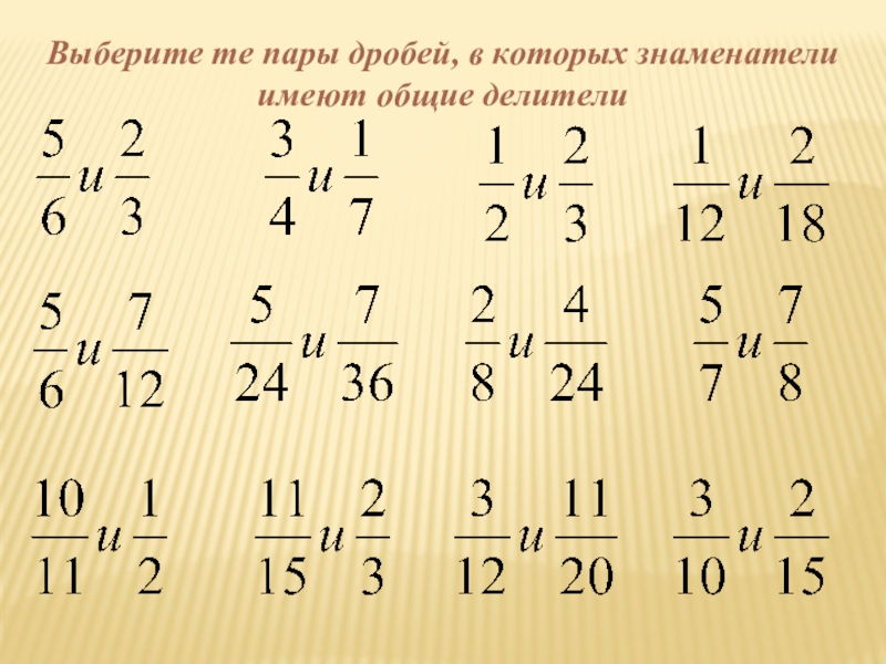 Слайд 5Выберите те пары дробей, в которых знаменатели имеют общие делители