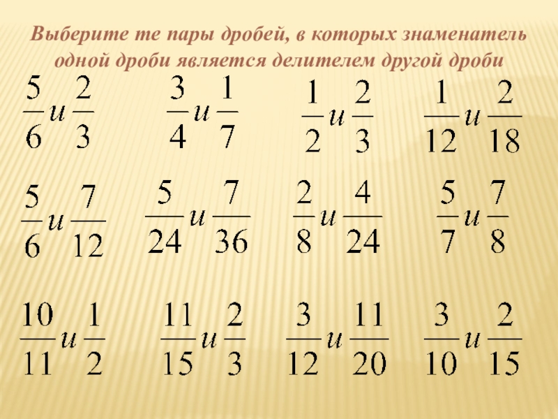 Слайд 4Выберите те пары дробей, в которых знаменатель одной дроби является делителем