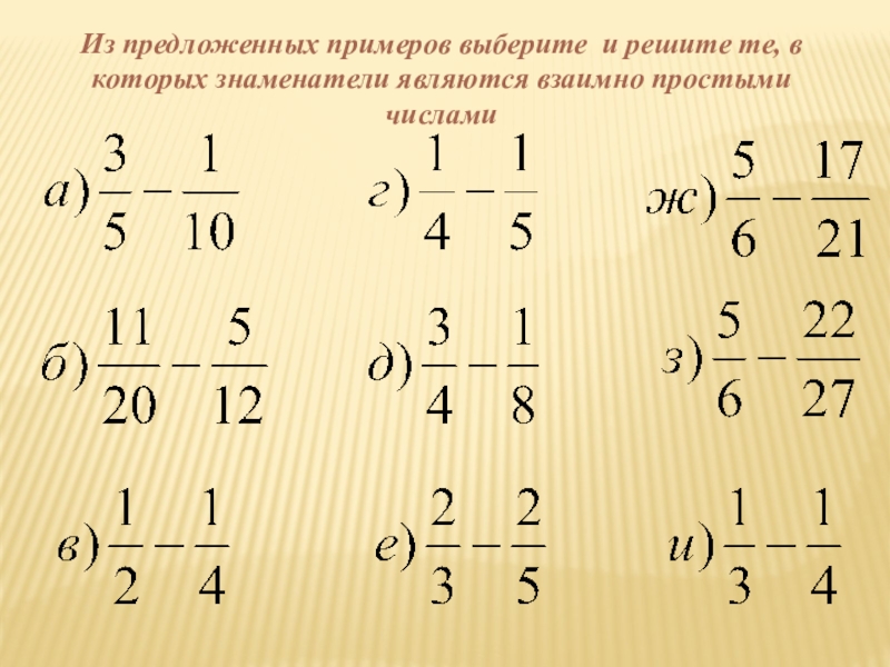 Из предложенных примеров выберите и решите те, в которых знаменатели являются взаимно простыми числами