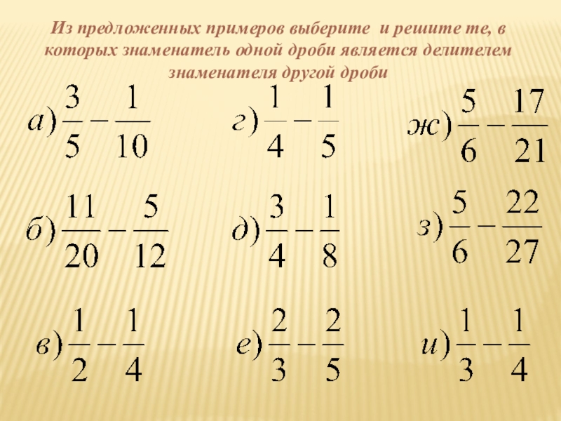 Из предложенных примеров выберите и решите те, в которых знаменатель одной дроби является делителем знаменателя другой дроби