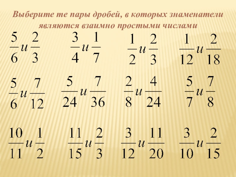 Слайд 3Выберите те пары дробей, в которых знаменатели являются взаимно простыми числами