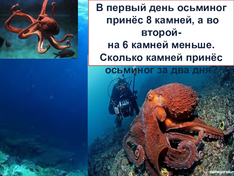 В первый день осьминог принёс 8 камней, а во второй-на 6 камней меньше. Сколько камней принёс осьминог