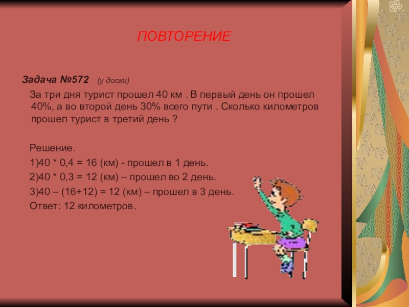 2)40 * 0,3 = 12 (км) – прошел во 2 день.