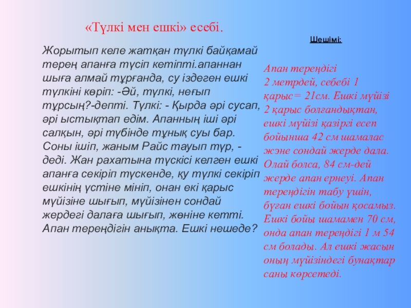 2 қарыс болғандықтан, ешкі мүйізі қазіргі есеп бойынша 42 см шамалас жэне сондай жерде дала. Олай болса, 84 см-дей жерде апан ернеуі. Апан тереңдігін табу үшін, бүған ешкі бойын қосамыз. Ешкі бойы шамамен 70 см, онда апан тереңдігі 1 м 54 см болады. Ал ешкі жасын оның мүйізіндегі бунақтар саны көрсетеді.