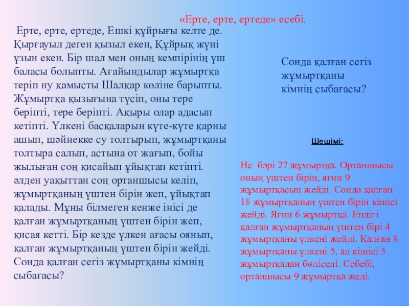 Не бәрі 27 жұмыртқа. Ортаншысы оның үштен бірін, яғни 9 жұмыртқасын жейді. Сонда қалған 18 жұмыртқаның үштен бірін кішісі жейді. Яғни 6 жұмыртқа. Ендігі қалған жұмыртқаның үштен бірі 4 жұмыртқаны үлкені жейді. Қалған 8 жұмыртқаны үлкені 5, ал кішісі 3 жұмыртқадан бөліседі. Себебі, ортаншысы 9 жұмыртқа жеді.