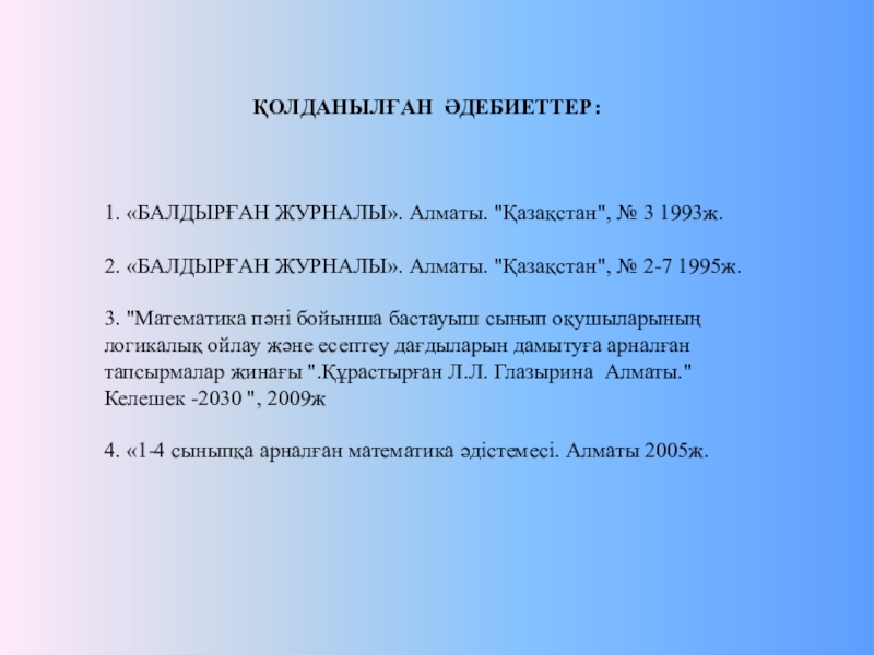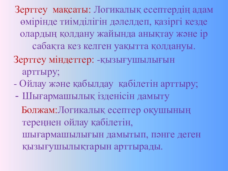 Болжам:Логикалық есептер оқушының тереңнен ойлау қабілетін, шығармашылығын дамытып, пәнге деген қызығушылықтарын арттырады.