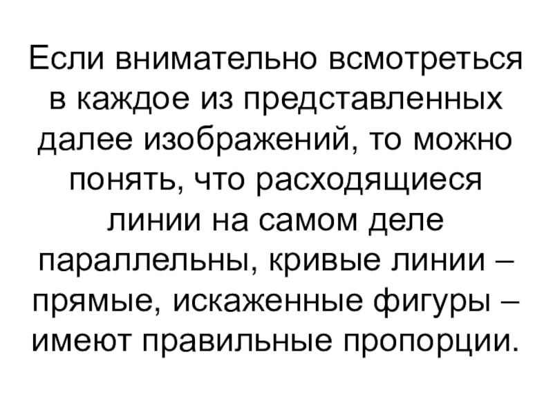 понять, что расходящиеся линии на самом деле параллельны, кривые линии – прямые, искаженные фигуры – имеют правильные пропорции.