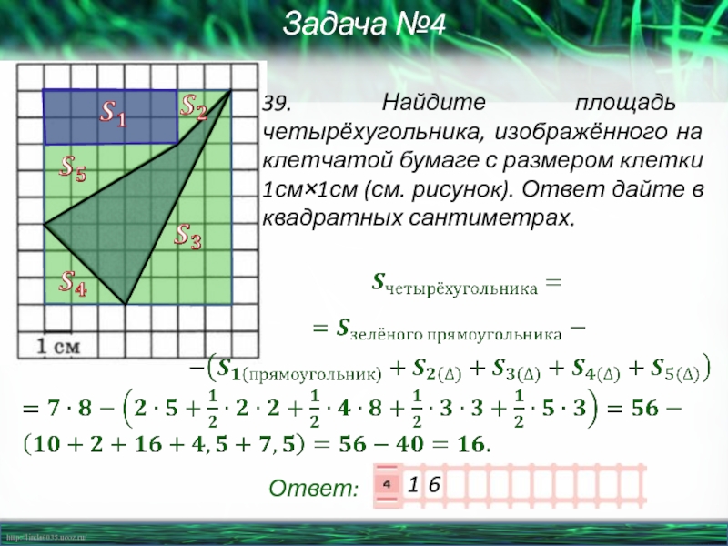 2. Найдите площадь треугольника, изображённого на клетчатой бумаге с размером клетки 1 см × 1 см (см. рис.). Ответ дайте в квадратных сантиметрах.