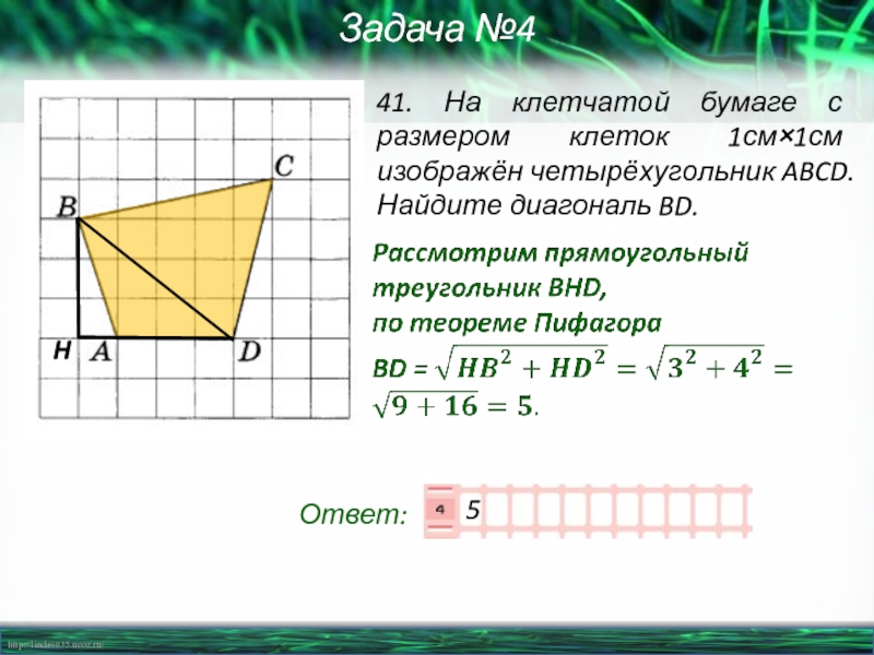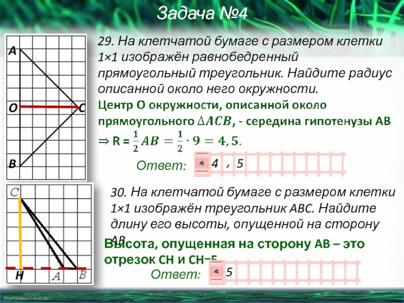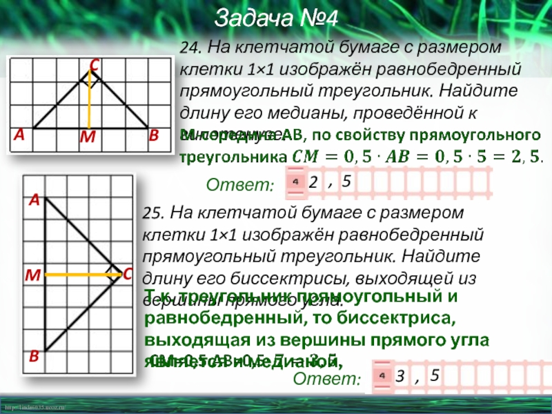 21. На клетчатой бумаге с размером клетки 1×1 изображён равнобедренный прямоугольный треугольник. Найдите длину его медианы, проведённой к гипотенузе.