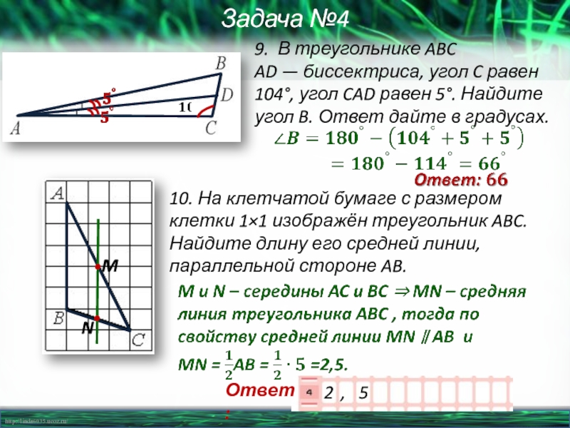 10. На клетчатой бумаге с размером клетки 1×1 изображён треугольник ABC. Найдите длину его средней линии, параллельной стороне AB.