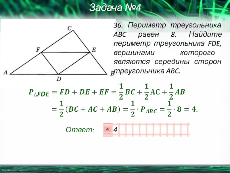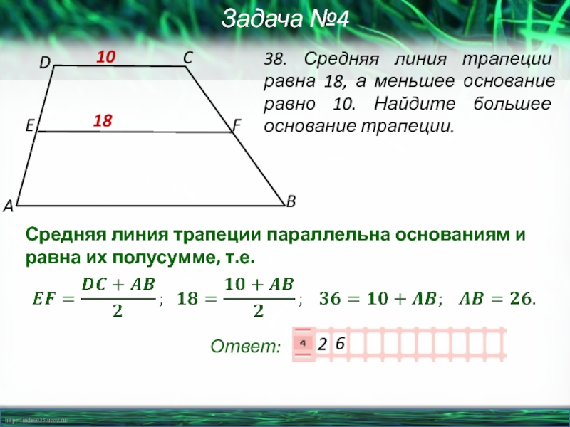 Средняя линия трапеции параллельна основаниям и равна их полусумме, т.е.
