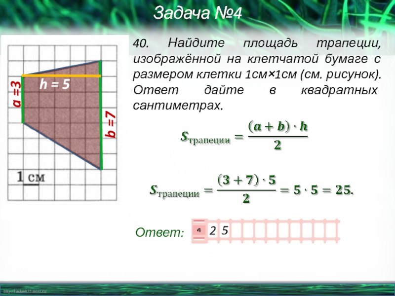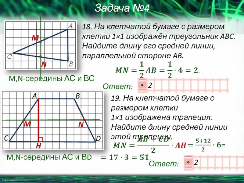19. На клетчатой бумаге с размером клетки 1×1 изображена трапеция. Найдите длину средней линии этой трапеции.