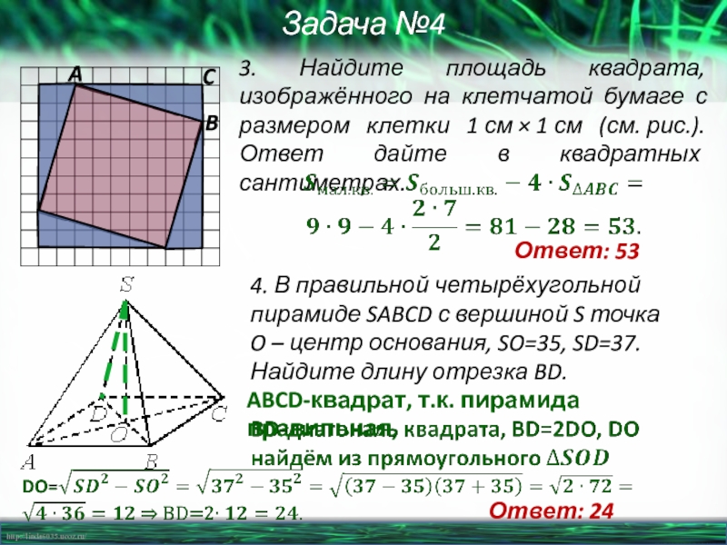 4. В правильной четырёхугольной пирамиде SABCD с вершиной S точка O – центр основания, SO=35, SD=37. Найдите длину отрезка BD.