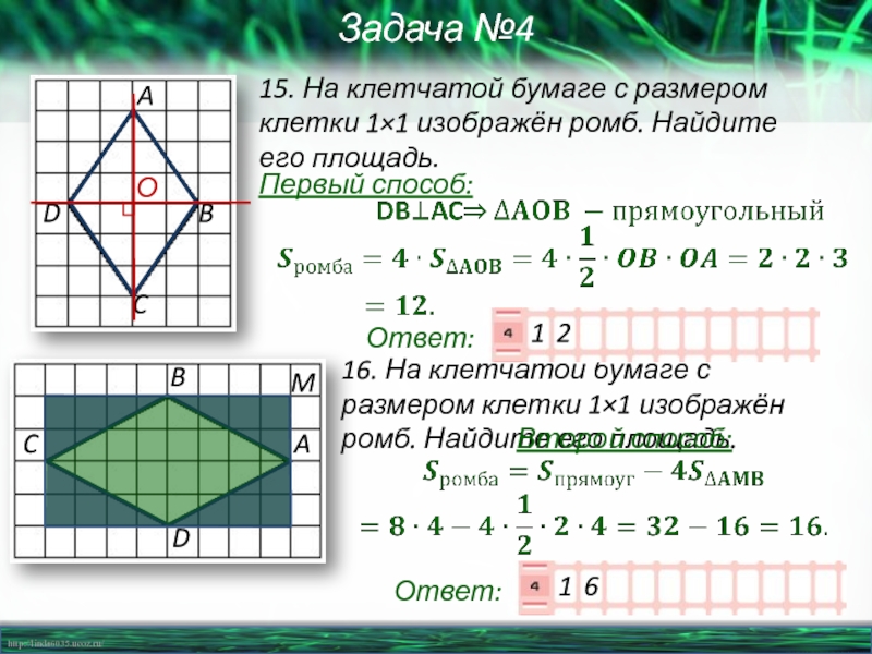 16. На клетчатой бумаге с размером клетки 1×1 изображён ромб. Найдите его площадь.