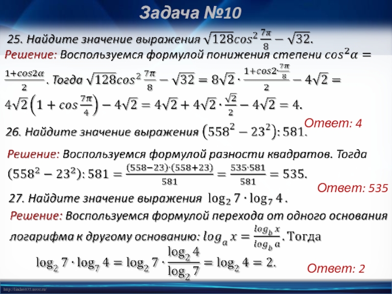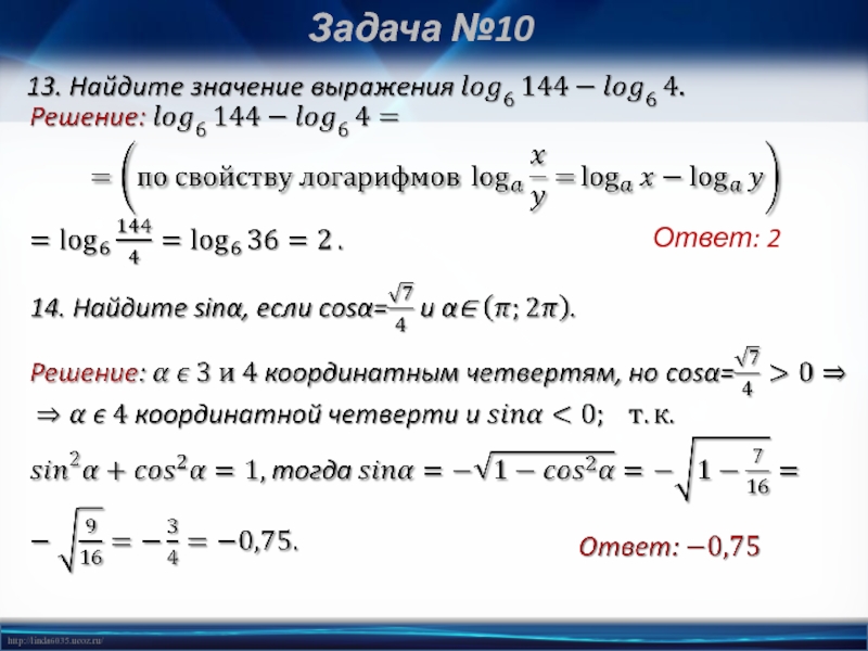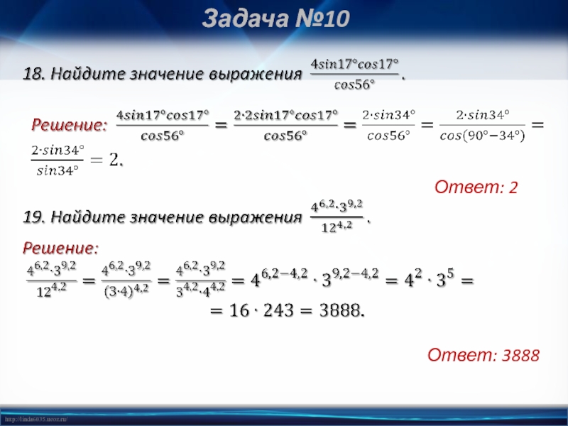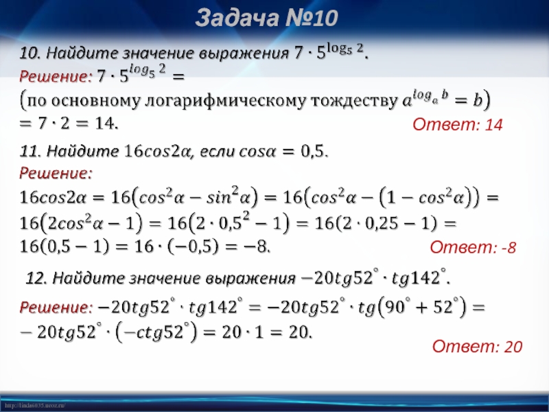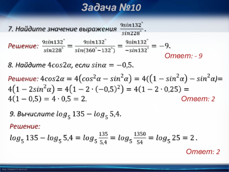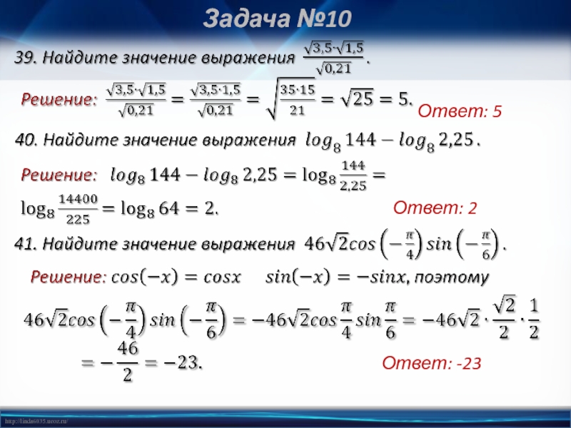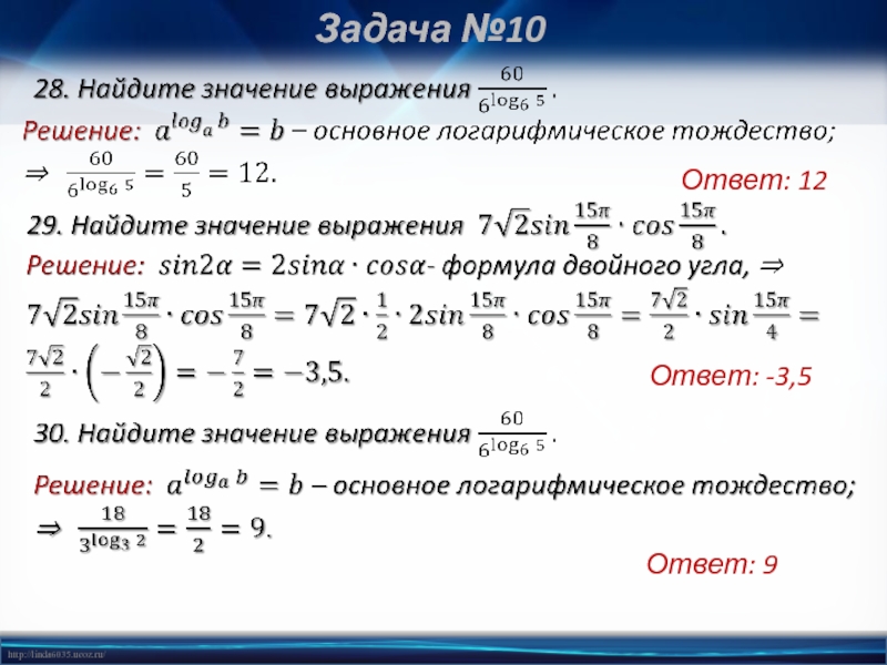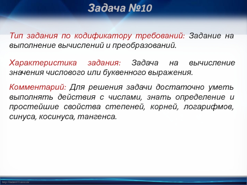 Комментарий: Для решения задачи достаточно уметь выполнять действия с числами, знать определение и простейшие свойства степеней, корней, логарифмов, синуса, косинуса, тангенса.