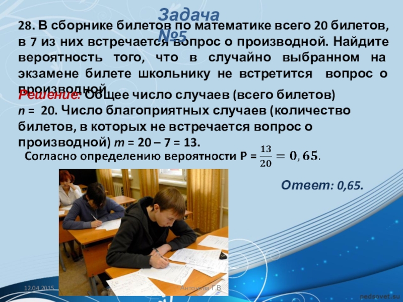 n = 20. Число благоприятных случаев (количество билетов, в которых не встречается вопрос о производной) m = 20 – 7 = 13.