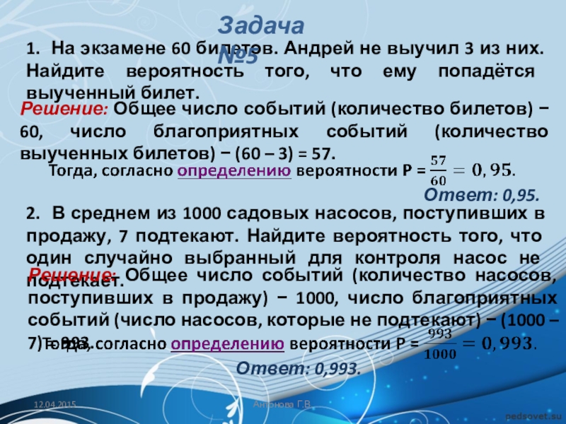 Решение: Общее число событий (количество насосов, поступивших в продажу) − 1000, число благоприятных событий (число насосов, которые не подтекают) − (1000 – 7) = 993.