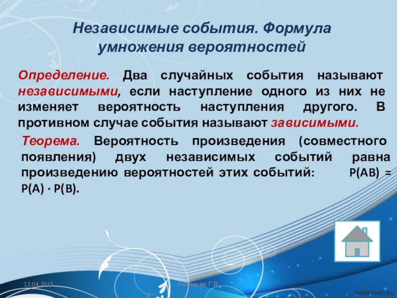 Теорема. Вероятность произведения (совместного появления) двух независимых событий равна произведению вероятностей этих событий: P(AB) = P(A) · P(B).