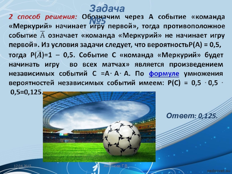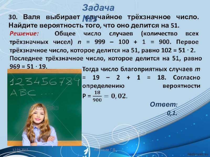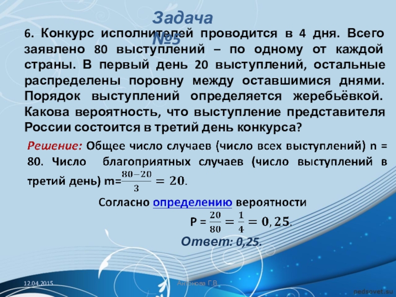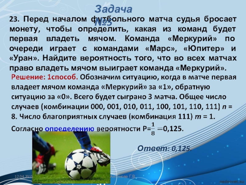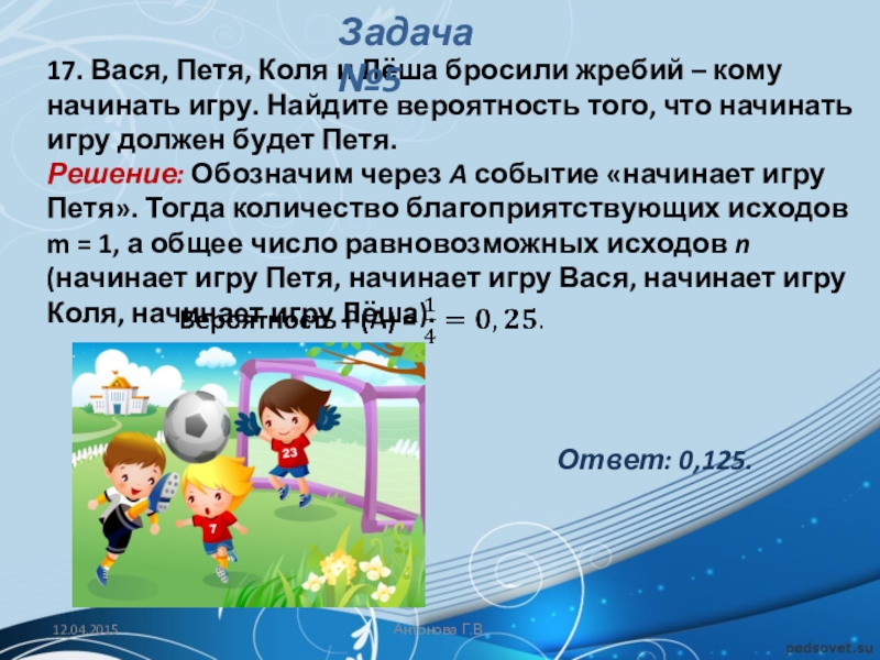 Решение: Обозначим через A событие «начинает игру Петя». Тогда количество благоприятствующих исходов m = 1, а общее число равновозможных исходов n (начинает игру Петя, начинает игру Вася, начинает игру Коля, начинает игру Лёша).