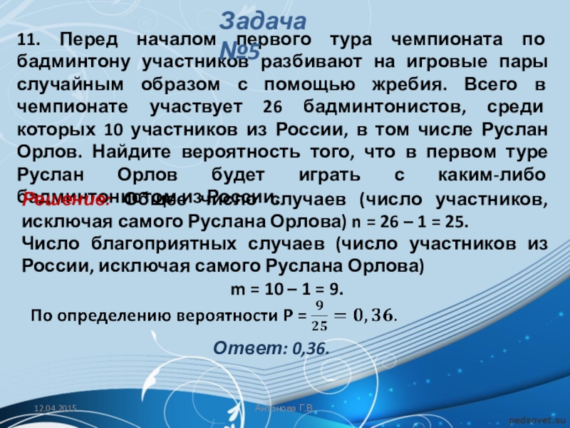 Решение: Общее число случаев (число участников, исключая самого Руслана Орлова) n = 26 – 1 = 25.
