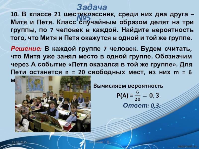 Решение: В каждой группе 7 человек. Будем считать, что Митя уже занял место в одной группе. Обозначим через А событие «Петя оказался в той же группе». Для Пети останется n = 20 свободных мест, из них m = 6 мест.