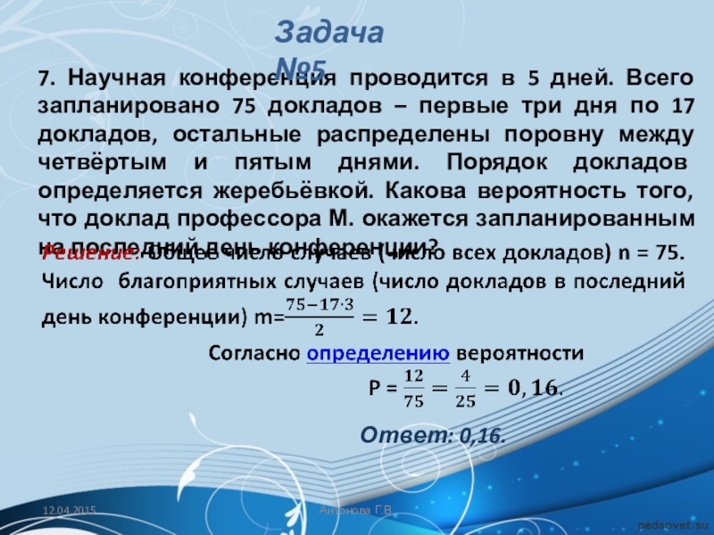 Решение: Обозначим через А событие «команда России во второй группе». Тогда количество благоприятных событий m = 4 (четыре карточки с номером 2), а общее число равновозможных событий n = 16 (16 карточек).