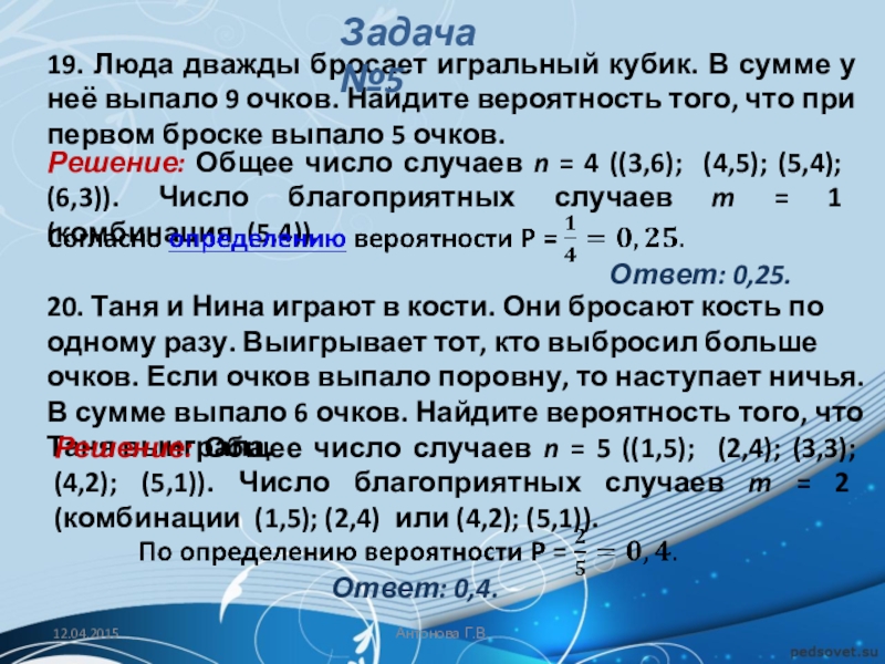 20. Таня и Нина играют в кости. Они бросают кость по одному разу. Выигрывает тот, кто выбросил больше очков. Если очков выпало поровну, то наступает ничья. В сумме выпало 6 очков. Найдите вероятность того, что Таня выиграла.
