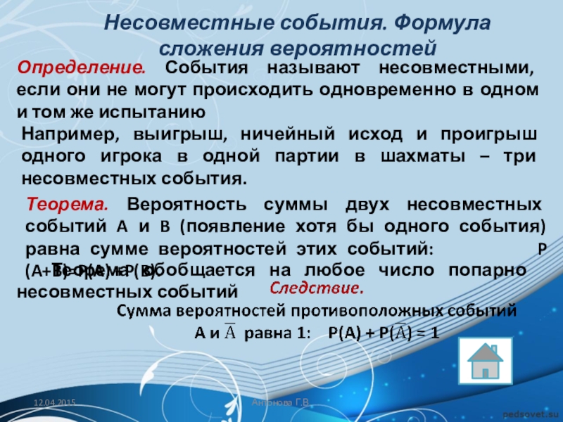 Например, выигрыш, ничейный исход и проигрыш одного игрока в одной партии в шахматы – три несовместных события.