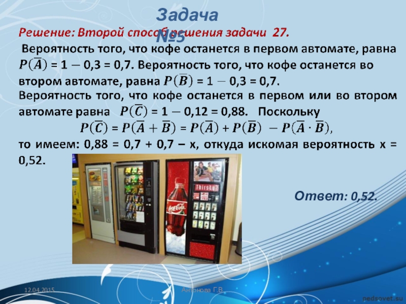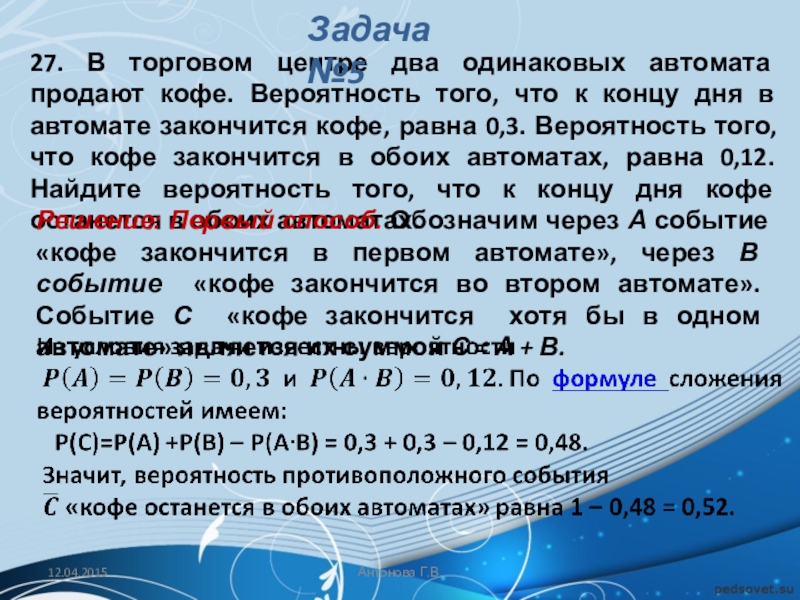Решение: Первый способ. Обозначим через А событие «кофе закончится в первом автомате», через В событие «кофе закончится во втором автомате». Событие С «кофе закончится хотя бы в одном автомате» является их суммой С = А + В.